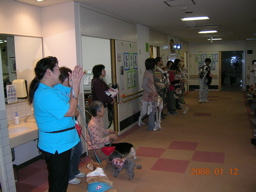 活動内容:個々のご愛犬によるふれあいを中心に、初めと終わりに一発芸を披露し、お散歩体験もして頂きました。また途中、2階フロアに上がり降りてこられない方々のところにも行き、ふれあっていただきました。