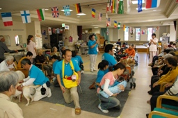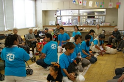活動内容:最初に一発芸(童謡「赤とんぼ」を待てで合唱)等をしながら自己紹介をし、個々のご愛犬(猫)によるふれあいを中心に、最後に参加型のレトリーブを取り込み活動しました。最後に昨年同様、社協の館長さんのご挨拶がありました。(非番の職員さんとその子供さん計4名もふれあっていただきました。)