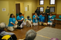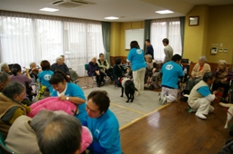 活動内容:最初に一発芸等しながら自己紹介した後、個々のご愛犬(猫)によるふれあいを中心に活動し、最後に参加型レトリーブを職員の方も含めみなさんにやっていただきました。(職員の方々のやるのを対象者の方々が興味津々で観ていらっしゃいました。)