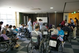 活動内容:最初に一発芸等をしながら自己紹介をした後、個々のご愛犬(猫)によるふれあいを中心に、約2時間を使い室内の会議室と屋外のリハビリ用の庭園で対象者様にお越しいただき、少しお散歩体験も交え、触れ合って頂きました。