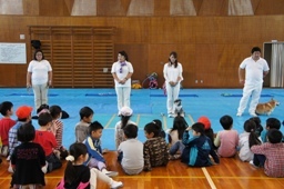 活動内容:AAE(動物介在教育)として、1~2時限の授業にて1~2年生の児童計約250名を対象に体育館を使って、前半は命の大切さ(心音計も含め))や犬との接し方を伝え、後半は実際に犬猫と触れ合っていただき活動しました。